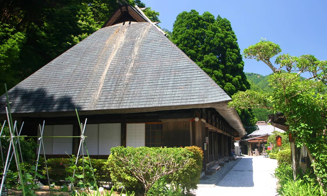 擁有一列排開的平面結構,在建築前方配置了一列長廊。是在缺乏平地的環境下,充分運用空間的智慧。被指定為國家重要文化財時原本是茅草屋,從昭和 38 年(1963 年)之後為了防止火災而改為銅板屋頂。