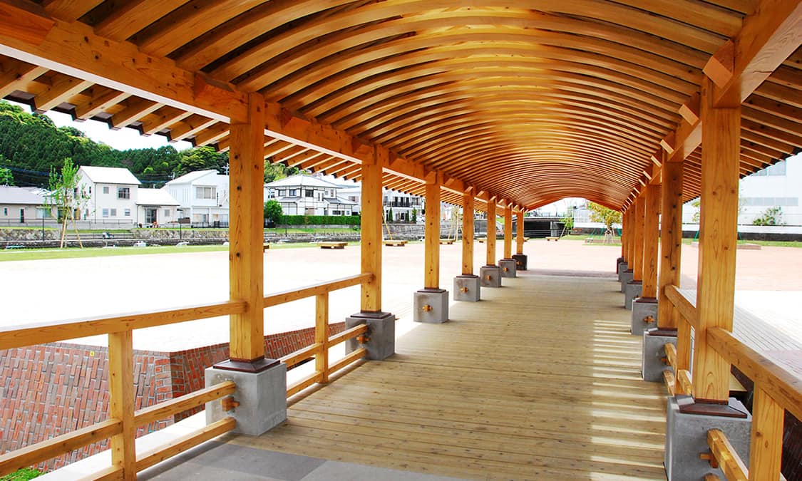 於平成 19 年竣工的油津新地標。使用了樹齡 120 年的飫肥杉與飫肥石,而不使用鐵釘等金屬的傳統工法「木頭組合」建造而成。天井活用了飫肥杉「彎木」的彈性特徵組成。夢見橋周圍的廣場是由紅磚鋪成,一到晚上便會點上暖色燈光,散發出時尚的氛圍。而且地面上還殘留著過去路線的痕跡,更添一層歷史的色彩。