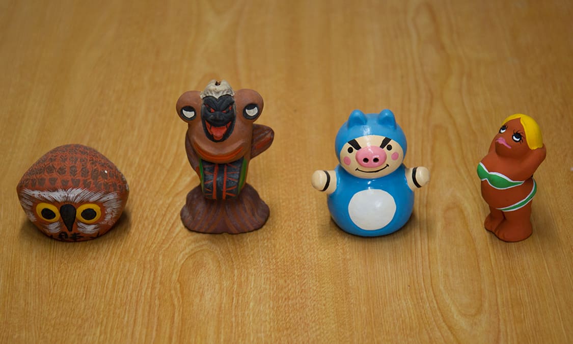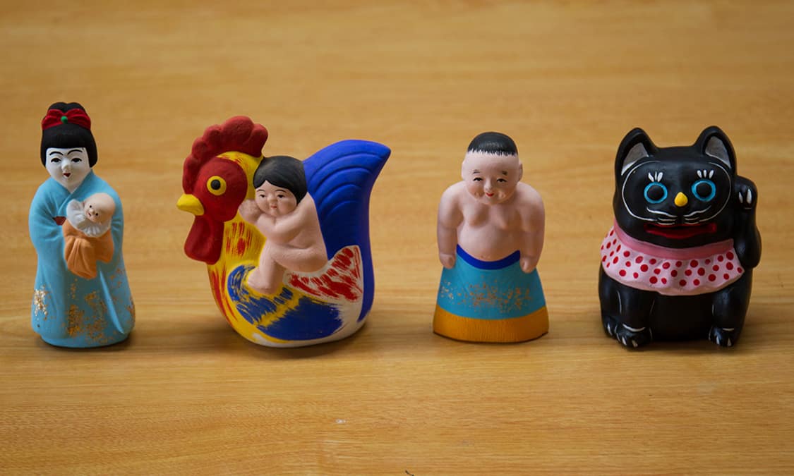 先以石膏捏製出人偶或面具等原型。成型的作品經過素燒之後,再用胡粉一層層完全塗白,接著以繪具一個個上色後再次燒成。每一天都要經過如此一次次細膩的工程後,才會誕生出弓野人偶。