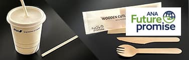 ANA 集團自 2020 年 4 月起已由塑膠餐具轉換為使用木製餐具,而這次更推出木製餐具翻新款式,不僅更耐用,也可更穩定供應。餐具套組包括木製叉匙、刀子、牙籤和竹製紙巾,於 2021 年 9 月起依序提供。這是第一款印有「ANA Future Promise」標誌的機內備品。