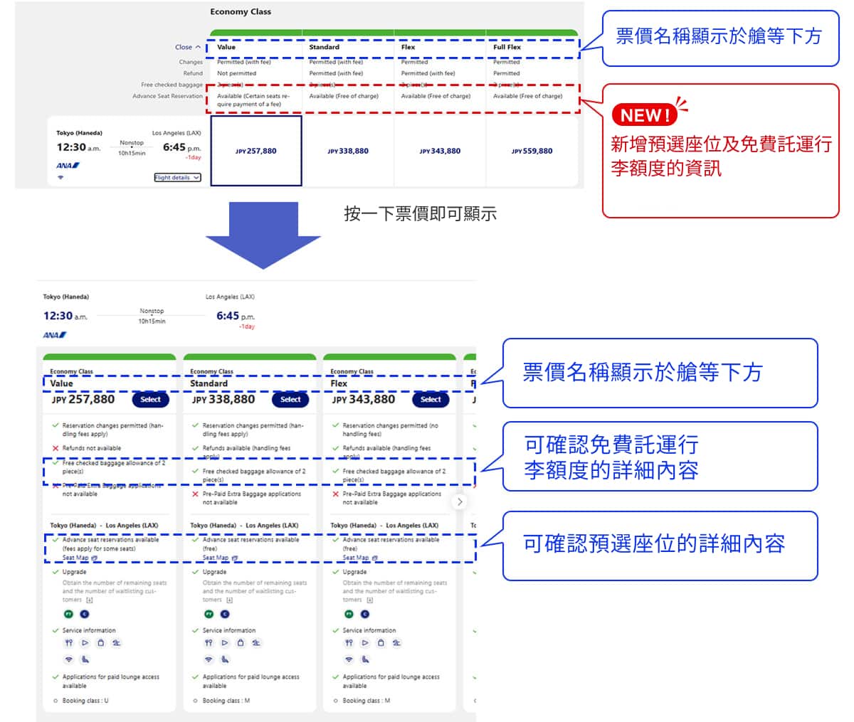 在 ANA 官網上的指定航線空位狀況確認畫面當中,除了可查看票價的詳細資訊與使用條款,亦可參閱各票價的預選座位、免費託運行李額度等相關內容。