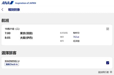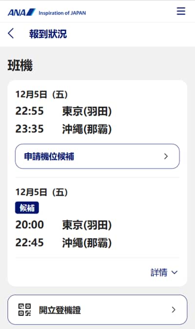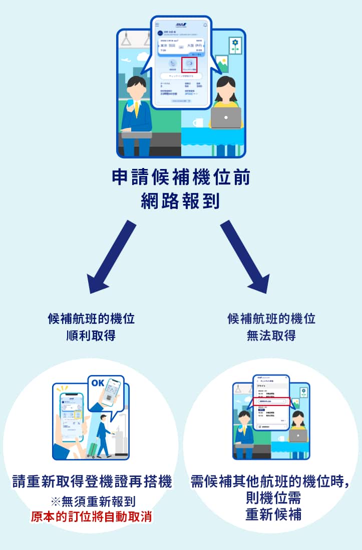 | 先備條件 | 如在 ANA 官方網站申請候補機位,需先完成當天原定航班的報到手續。 |