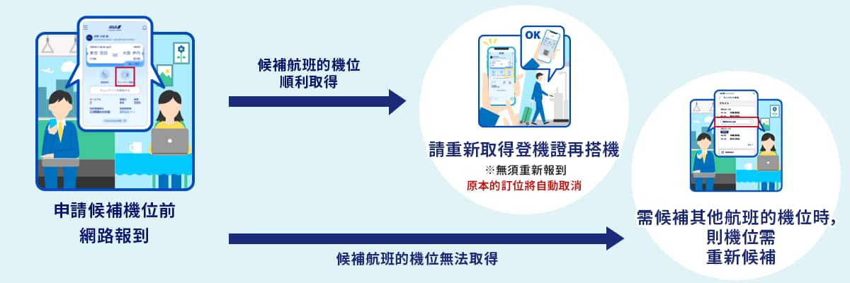 | 已取得候補機位 | 若取得候補機位,原訂位將自動取消。 * 若搭乘原定航班,請務必最遲在候補航班出發時間前 20 分鐘取消候補申請。另外,系統會為旅客自動完成取得候補機位之航班的劃位報到手續,因此無須自行辦理候補報到。 |