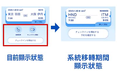 如搭乘從使用舊系統的機場出發之航班,自出發時間前 24 小時起,ANA App 的首頁畫面將不再顯示「更改座位」、「取消 / 更改報到」、「列印登機證」按鈕,改為顯示「開始報到、確認訂位」按鈕。
