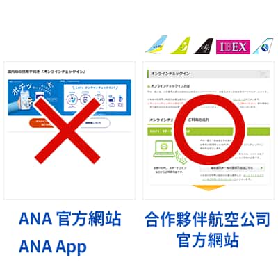 日本國內合作夥伴航空公司營運航班*2 在使用舊系統的機場,仍可繼續在 ANA 官方網站 / ANA App 辦理網路報到。